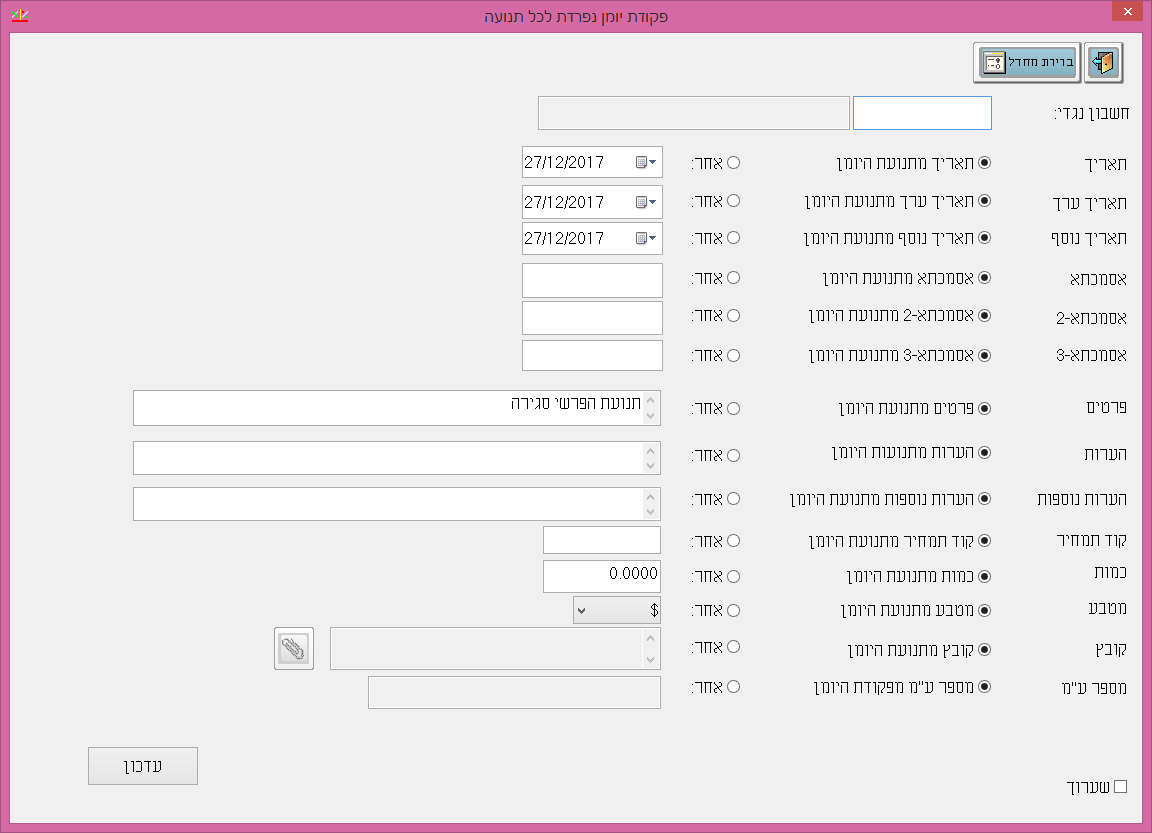 באמצעות ממשק זה ניתן לעדכן נתונים נוספים במסמכים שהופקו. לממשק זה נוספו שדות רבים לממשק ואף התווספה אפשרות לעדכן שדות מהתנועה במסמך.