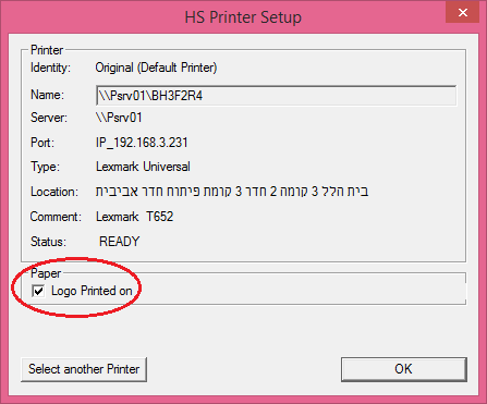 בוחרים בתפריט הקליק הימני של התוכנה בסעיף הגדרת מדפסת מקור. אם המקור מודפס על ניר לוגו, יש לסמן את הסעיף החדש: Logo Printed on (ראו צילום מסך רצ"ב).