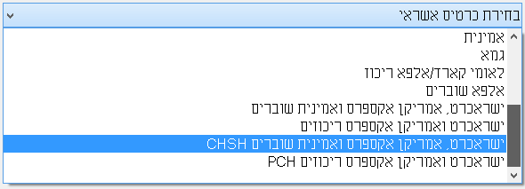 לקליטת דף מחברת האשראי מקליקים בחלק התחתון של המסך על הסעיף בחירת כרטיסי אשראי. כעת תופיע הרשימה הבאה: